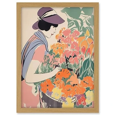 Artery8 Woman at the Flower Market Watercolour Spring Bouquet Danish Pastel Aesthetic Artwork Framed A3 Wall Art Print