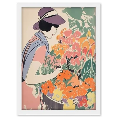 Artery8 Woman at the Flower Market Watercolour Spring Bouquet Danish Pastel Aesthetic Artwork Framed A3 Wall Art Print