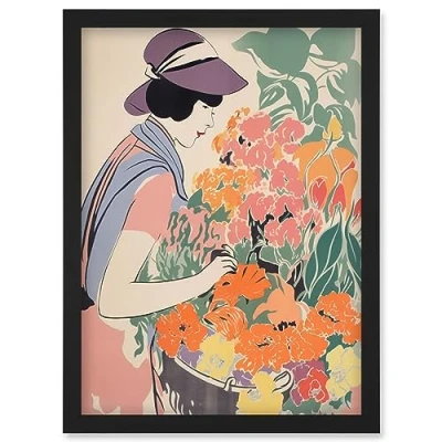 Artery8 Woman at the Flower Market Watercolour Spring Bouquet Danish Pastel Aesthetic Artwork Framed Wall Art Print A4