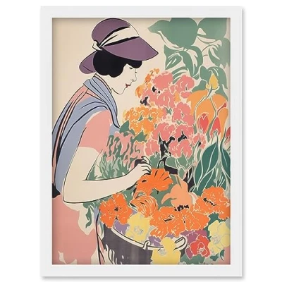 Artery8 Woman at the Flower Market Watercolour Spring Bouquet Danish Pastel Aesthetic Artwork Framed Wall Art Print A4