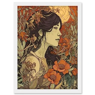 Artery8 Woman in Autumn Poppy Field Linocut Illustration Artwork Framed A3 Wall Art Print
