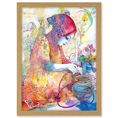 Artery8 Woman Planting Flowers Lace Pattern Folk Art Watercolour Painting Artwork Framed A3 Wall Print