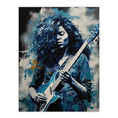 Artery8 Woman Playing The Electric Guitar Acrylic Painting Female Blues Musician Splat Paint Portrait Music Large Wall Art Poster Print Thick Paper 18X24 Inch