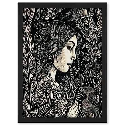 Artery8 Woman with Crow in a Field Black and White Linocut Artwork Framed A3 Wall Art Print