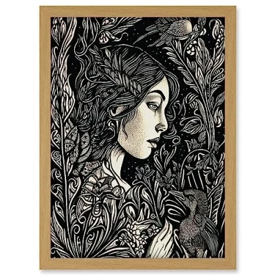 Artery8 Woman with Crow in a Field Black and White Linocut Artwork Framed A3 Wall Art Print