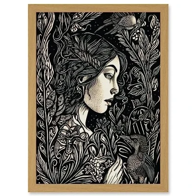 Artery8 Woman with Crow in a Field Black and White Linocut Artwork Framed Wall Art Print A4