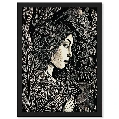 Artery8 Woman with Crow in a Field Black and White Linocut Artwork Framed Wall Art Print A4
