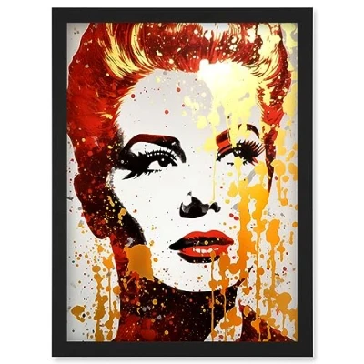 Artery8 Woman with Red Lipstick Retro Glam Face Portrait Liquid Gold Paint Linocut Teen Room Artwork Framed Wall Art Print A4