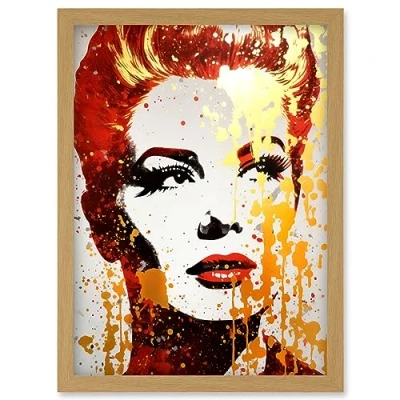 Artery8 Woman with Red Lipstick Retro Glam Face Portrait Liquid Gold Paint Linocut Teen Room Artwork Framed Wall Art Print A4
