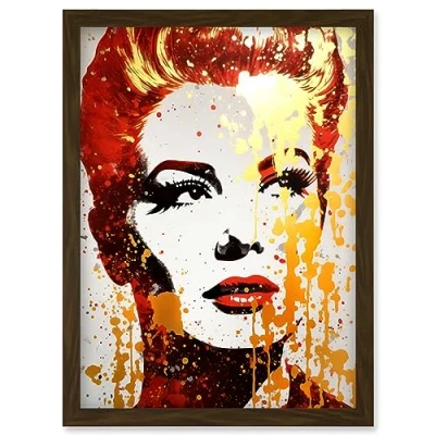 Artery8 Woman with Red Lipstick Retro Glam Face Portrait Liquid Gold Paint Linocut Teen Room Artwork Framed Wall Art Print A4