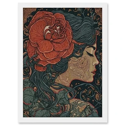 Artery8 Woman with Rose in her Hair Linocut Illustration Artwork Framed A3 Wall Art Print