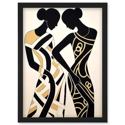 Artery8 Women Dancing Abstract Pattern Dress Beige Black Silhouettes Body Line Artwork Framed Wall Art Print A4