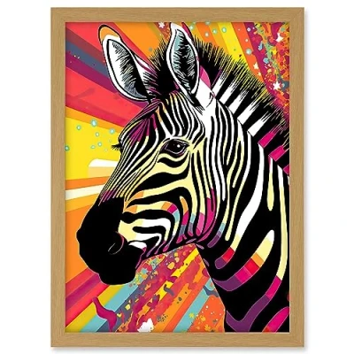 Artery8 Zebra Portrait Vibrant Colourful Stripes Bright Bold Psychedelic Rainbow Artwork Framed A3 Wall Art Print