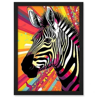 Artery8 Zebra Portrait Vibrant Colourful Stripes Bright Bold Psychedelic Rainbow Artwork Framed A3 Wall Art Print