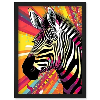 Artery8 Zebra Portrait Vibrant Colourful Stripes Bright Bold Psychedelic Rainbow Artwork Framed Wall Art Print A4