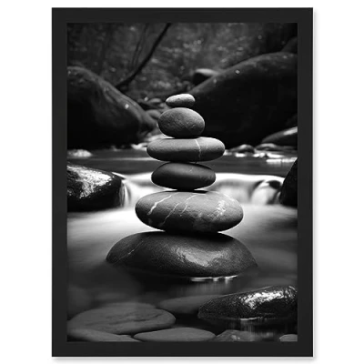 Artery8 Zen Stacking Stones in River Black and White Photo Artwork Framed A3 Wall Art Print