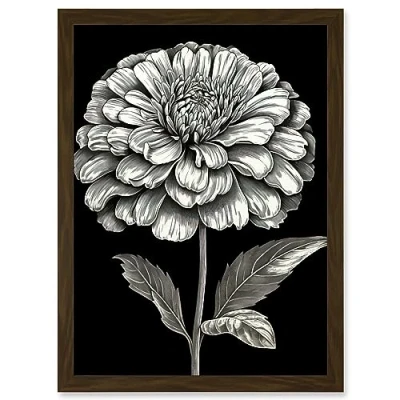 Artery8 Zinnia Flower Bloom Black and White Illustration Artwork Framed A3 Wall Art Print