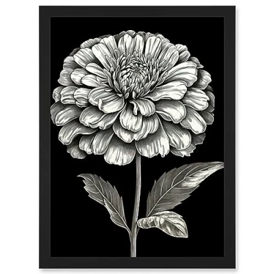 Artery8 Zinnia Flower Bloom Black and White Illustration Artwork Framed Wall Art Print A4