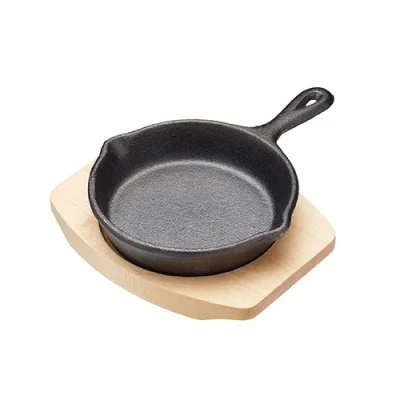 Sizzling dishes of food can be taken straight to the table from the oven in this elegant cast iron round mini fry pan and the wooden board will protect your table top. Ideal for serving appetisers, accompaniments and sauces. Fry pan is grill and oven safe up to 250°c. Dimensions:Pan - 11.5cm x 16cm x 2.5cm;Wooden Board - 13.5cm x 10.5cm x 1.5cm.5 year guarantee.
