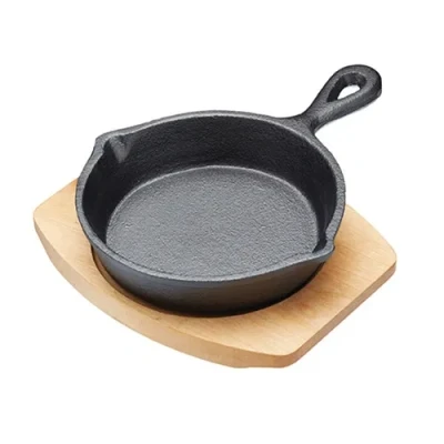 Sizzling dishes of food can be taken straight to the table from the oven in this elegant cast iron round fry pan and the wooden board will protect your table top. Slightly larger than the mini fry pan this is ideal for starters, desserts and accompaniments. Fry pan is grill and oven safe up to 250°c. Dimensions:Pan - 15cm x 20cm x 3cmWooden Board - 13cm x 17cm x 1.5cm.5 year guarantee