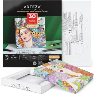 Arteza Adult Colouring Book, 25.5 x 29.1 cm, 15.3 cm Folded, 30 Sheets, Portrait Illustrations, 350 GSM, DIY Sheets for Relaxing