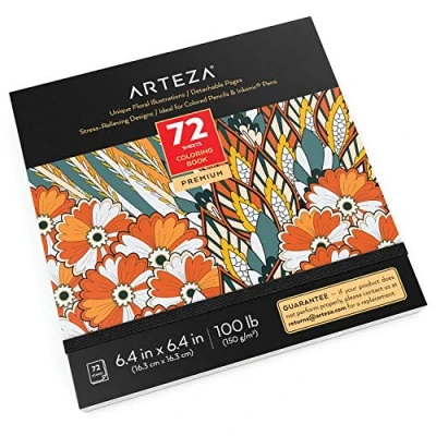 Arteza Adult Colouring Book, Floral Designs, 72 Sheets, 100 lb, 6.4x6.4 Inches, Detachable Pages, Black Outlines, Stress Relieving Books for Women & Men