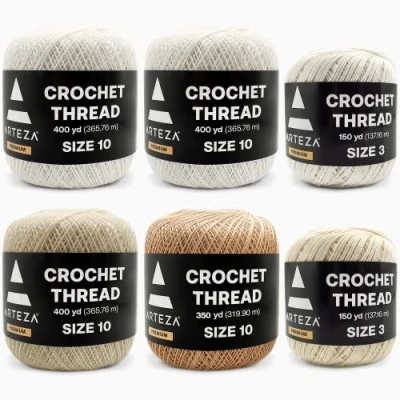 Crochet Your Most Memorable Pieces: This crochet yarn pack contains all you need to stitch dazzling creations. Includes 4 balls of crochet thread size 10 and 2 balls of size 3 thread in White, Natural, and Beige. Made from 100% mercerized cotton for remarkable softness and color that won't fade. Versatile for an Assortment of Projects: Whether you’re a beginner or an experienced crocheter, this knitting yarn set makes it easier to stitch. Use size 10 thread to create dolls, socks, and flower ornaments. Get creative with size 3 thread for table runners, book markers, jewelry sacks, and more. Value Pack of Yarn for Knitting: This pack has plenty of thread for your all project needs. With 4 balls of size 10 (2 White, 1 Natural & 1 Beige) and 2 balls of size 3 (1 White & 1 Natural), you have everything you need to start crafting. Quality Mercerized Cotton: This mercerized cotton crochet thread boasts superior strength, so it won't fray or break easily when stretched or pulled during crocheting. The thread’s high luster has extra shine, lending your pieces a more luxurious look. Machine washable. Craft Supplies for Arts and Crafts Lovers: Arteza was built to support artists everywhere by providing top-of-the-line craft tools. Find tons of art products to help you explore the world of DIY crafts. If you have any issues with our products, please reach out, and we’ll make it right.