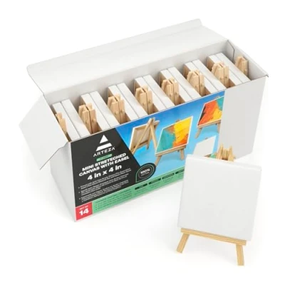 14 Pack of Arteza Mini Canvases with Easels [10.16 x 10.16 cm] We use solid pine wood to build our easels and the frames of our mini canvases. Choice pack of mini canvases for painting for painting parties, classroom projects, and kids craft time. Extremely Durable 100% Cotton Canvas, Primed with Gesso: Our canvases are primed with acid-free acrylic gesso, and they’re stretched and securely glued to pine wood stretcher bars. Work well with acrylic, oil, and other paint media. Reusable 12.7 cm Solid Pine Wood Easels: The reusable small mini easels included in this pack are solidly constructed so that they can be used for other future projects. Created by Arteza Artists: Here at Arteza, we are passionate about creating products that inspire. For us, art is an expression of the human experience. That’s why we work to make Arteza art supplies accessible to all people. We Care About Our Customers: We want to ensure you have a great experience with our products, because we truly care about our customers. Our team strives to create products we can stand behind. If you have any issues, please reach out and we’ll make it right.