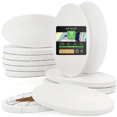 ARTEZA Oval Stretched Canvas Set, 12 Pack, 10 x 20.3 cm, 100% Cotton, 8 oz Gesso Primed Blank Canvases, Art Supplies for Acrylic and Oil Painting