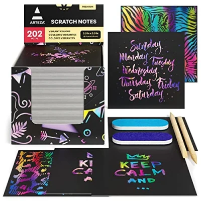ARTEZA Scratch Paper Notes, Set of 202 Sheets, 3.5"x3.5" inches 200 Rainbow Notes & 2 Space Patterned Include Scratchers, Sharpeners, Art Craft DIY Projects