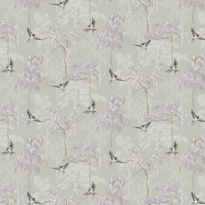 Soaring birds fly over an enchanting Japanese treescape. Seen here in the Grey colourway.