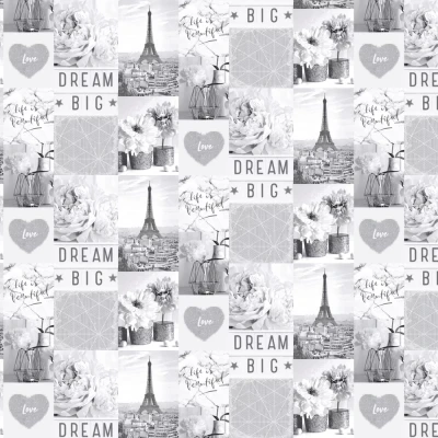 A quirky and charismatic design that showcases a collage of scenes including florals, quotes and landscapes! Seen here in the Grey colourway.