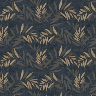 A trailing leaf design on a faux fabric texture background. Shown in the navy / champagne colourway. Co-ordinating plain available.