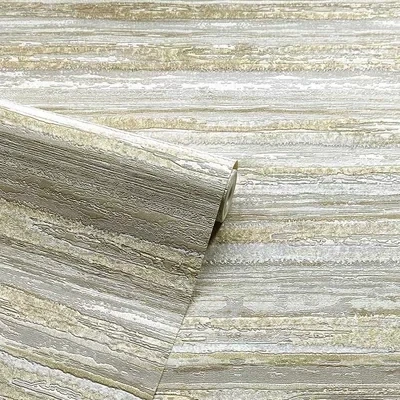 A subtle horizontal stripe effect design with brush stroke like lines in cream and gold with metallic / glitter detail. Heavy weight vinyl. Pattern repeat is 53cm with a straight pattern match.