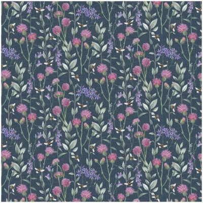 General description This charming wallpaper features a delightful botanical design that brings the serene beauty of a wildflower meadow into your home. The pattern is a gentle and repeating motif of various countryside flowers and delicate grasses, interspersed with busy little bumblebees. Each flower and leaf is beautifully illustrated with a soft, watercolor effect, giving the design a natural and airy feel. The flowers are rendered in a lovely palette of soft mauve thistles and elegant bluebell shapes, complemented by lush green leaves. Small, striped bumblebees are dotted throughout the design, adding a whimsical touch and a sense of life and movement to the pattern. The entire scene is set against a deep, rich navy blue background, allowing the vibrant wildflowers and charming insects to stand out with a sophisticated contrast, creating a cozy and inviting atmosphere. Technical specifications Material: Durable vinyl Roll Size: 10.05m x 53cm Approx. Coverage: 5.25msq (56 sq.ft)