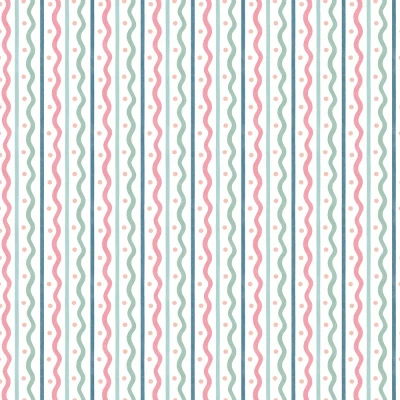 A digital image of a simple stripe pattern created from alternating straight and wiggly lines with dots in a highlight colour. In fresh shades of blue green and pinks.