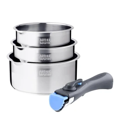 For everyday cooking: The Arthur Martin 3-piece stainless steel saucepan set is ideal for everyday use and for optimal storage: these products are stackable! It consists of 3 stainless steel saucepans 16/18/20 cm - 1 removable handle Easy cooking: Cook good dishes for you or your whole family with this set of saucepans from Arthur Martin. Removable handle allows for a comfortable grip NON-STICK COATING: It allows you to enjoy healthy cooking without adding fat. This 4-piece set has been designed for all hobs, including induction. These pans even go in the oven for more fun Arthur Martin guarantee: This cookware set for all heat sources including induction is guaranteed for 1 year. If you are not satisfied with this product, after sales service is there for you!, Weight: 4.40924524 pounds, Manufacturer: Arthur Martin