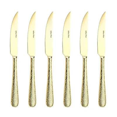 Featuring a harmonious blend of timeless tradition and contemporary flair, the Arthur Price Champagne Avalon Set of 6 Steak Knives is ideal for both daily dining and celebratory gatherings. Meticulously crafted from premium 18/10 stainless steel, this set of 6 steak knives boasts a distinctive hammered texture that not only enhances its visual appeal but also catches the light, elevating any dining experience. For an added touch of luxury, it features a subtle champagne gold PVD coating which is both hard-wearing and food-safe. This set is presented in gift box packaging which is fully recyclable.While dishwasher safe for convenience, hand washing is advised to preserve its brilliance.Plus, with a generous 50 year manufacturer's guarantee, you can trust in the enduring quality of the Arthur Price Champagne Avalon Set of 6 Steak Knives.  Knives are not for sale to persons under the age of 18. - all knives and bladed products are delivered by Age Verified Delivery (AVD). The carrier may request proof of age in order to deliver your parcel. If proof of age is not available, or the recipient is underage, the carrier will refuse to deliver.