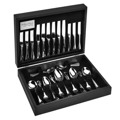 This Arthur Price Classic Baguette 44 Piece, 6 Person Canteen set comprises of 6 x Table Knives, 6 x Table Forks, 6 x Dessert Knives, 6 x Dessert Forks 6 x Dessert Spoons, 6 x Soup Spoons, 6 x Teaspoons, 2 x Serving Spoons and 1 x Mahogany Canteen Cabinet.The fluid lines of Baguette's understated pattern complements both modern and traditional settings.Timeless, classic patterns with an outstanding heritage and commitment to the finest quality manufacturing and service - these are the hallmarks of Arthur Price Classic stainless steel cutlery, where the traditions of four generations go into creating every piece of cutlery. The Arthur Price Classic collection epitomises an understated elegance which is so quintessentially English.This Arthur Price Classic Baguette 44 Piece Canteen is made from mirror polished 18/10 stainless steel and is dishwasher safe.Supplied with 50 year manufacturer's guarantee for your peace of mind.  Knives are not for sale to persons under the age of 18. - all knives and bladed products are delivered by Age Verified Delivery (AVD). The carrier may request proof of age in order to deliver your parcel. If proof of age is not available, or the recipient is underage, the carrier will refuse to deliver.