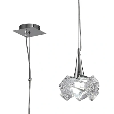 This is a multi-faceted construction which presents an ice-like veneer of glass cubes arranged in natural harmony. The angular structure cascades distorted prismatic patterns across walls and ceilings that captivate the eye. The simplicity of the polished chrome structures and the sharp formation of the crystal surround, are juxtaposed by its ethereal iridescence of light that the fitting gives out. With the glass shades available in two sizes there is a comprehensive range of lighting solutions available.