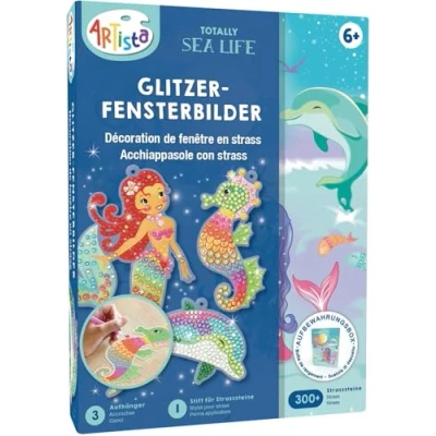 Sparkling rhinestone artwork for making charming window pictures! Complete craft kit, recommended for ages 6 and up. Let the trendy underwater motifs sparkle with great rhinestones - the finished pictures are ideal for decorating and giving as a gift. The DIY kit comes in an attractive storage box that holds all accessories. In addition, the box is high-quality and visually appealing like a gift box. Artista craft kits promote children's creativity, concentration and fine motor skills. Contents: 3 x hangers, 1 x rhinestone pen, 1 x wax adhesive plate, 1 x container, 3 x suction holders with hooks, 10 bags of different coloured rhinestones, 1 x instruction manual with pictures., Manufacturer: ARTISTA