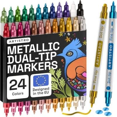 ARTISTRO 24 Colors Acrylic Paint Pens, Markers Dual Tip (Fine 1mm + Dot 5mm), Fabric for Textile, Canvas, Rock, Glass, Wood, Paper, DIY, Kids and Adults