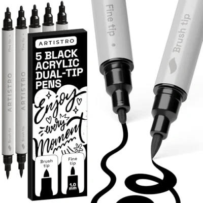 ARTISTRO 5 Black Dual Tip Acrylic Paint Pens 1 mm Brush + 1mm Fine Tips Multisurface Markers for Fabric, Glass, & More