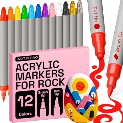 ARTISTRO Acrylic Paint Pens, Markers Dual Tip Markers, for Fabric, Canvas, Rock, Glass, Wood, Paper, DIY, (Dual Dot + Brush, 12)