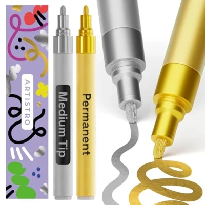 ARTISTRO Metallic Permanent Markers Set of 2 Gold & Silver Paint Pen, Oil Based Medium Tip 3mm, Waterproof Pens for Rock Painting, Ceramic, Glass, Wood, Tire, Fabric More