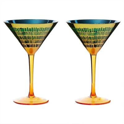Add a pop of metallic flair to your kitchen with the Artland Set of 2 Fiesta Cocktail Glasses. These Cocktail Glasses have a fun and unique design consisting of a golden background that blends into an amber hue down the stem of the glass.These Artland Fiesta Cocktail Glasses have a shapely, well-rounded bowl and a long, thin stem for a delicate look. An electroplated bowl makes for a mirrored finish to really make them stand out. They look great paired with other glasses from the Fiesta range, and make a great statement piece at your table setting.Made from 100% GlassHand wash onlyCapacity: 300ml