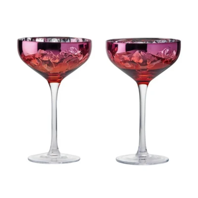 The Artland Bloom Champagne Saucers are a set of 2 glasses decorated in a chrome orange and fuschia and embossed with a delicate floral design to add elegance and grace.The orange to pink gradient ombre adds a colourful hue to your kitchen, while the mirrored silver inside completes the glass with a contemporary aesthetic.Set of 2Hand wash onlyDesigned in the UKDimensions: 115mm x 115mm x 180mm35cl capacity