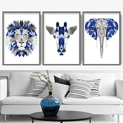 Artze Wall Art Geometric Jungle Heads Giraffe Lion Elephant Prints 3 Piece Set, 21 cm Width x 30 Height, Blue/Grey