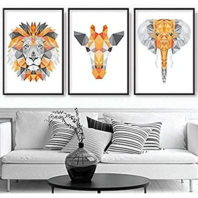 Artze Wall Art Geometric Jungle Heads Giraffe Lion Elephant Prints 3 Piece Set, 40 cm Width x 50 Height, Orange/Grey