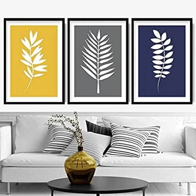 Artze Wall Art Tropical Fern Print 3 Piece Set, 30 cm Width x 40 Height, Yellow/Grey/Navy